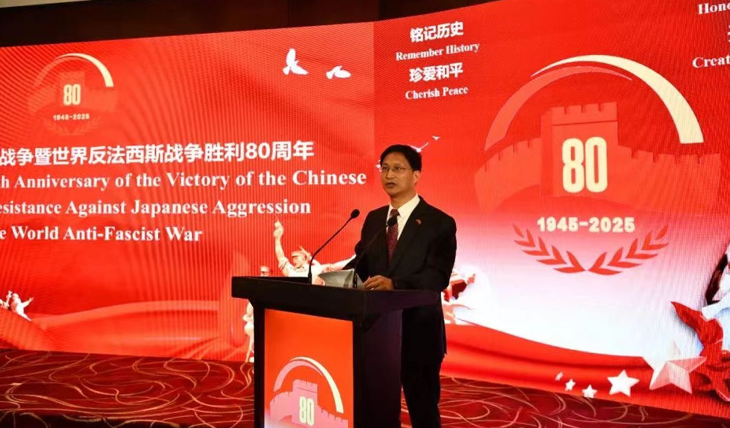 戚振宏大使在紀(jì)念中國人民抗日戰(zhàn)爭暨世界反法西斯戰(zhàn)爭勝利80周年招待會上發(fā)表講話(中國港灣 姜健/攝)