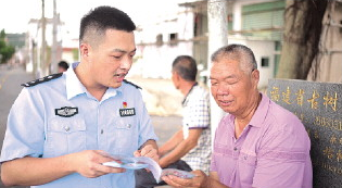 圖為施曉健進村居對老人進行反詐宣傳。 漳州市公安局龍文分局供圖