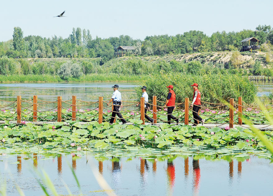 圖為8月19日,瑪納斯縣公安局蘭州灣鎮(zhèn)派出所八家戶警務(wù)室民警與瑪納斯國家濕地公園管委會(huì)工作人員一同在瑪納斯國家濕地公園開展巡邏。李進(jìn)福 攝