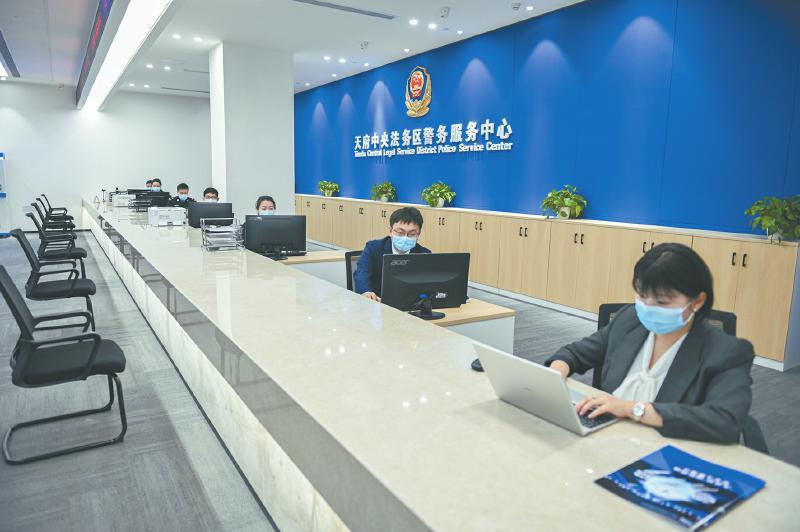 在天府中央法務區(qū)警務服務中心,共有公安出入境事務服務中心、天府知識產權保護促進中心、中國西部公共安全產品評估服務中心、“天府杯”國際網絡安全大賽聯絡辦公室4個項目首批入駐。