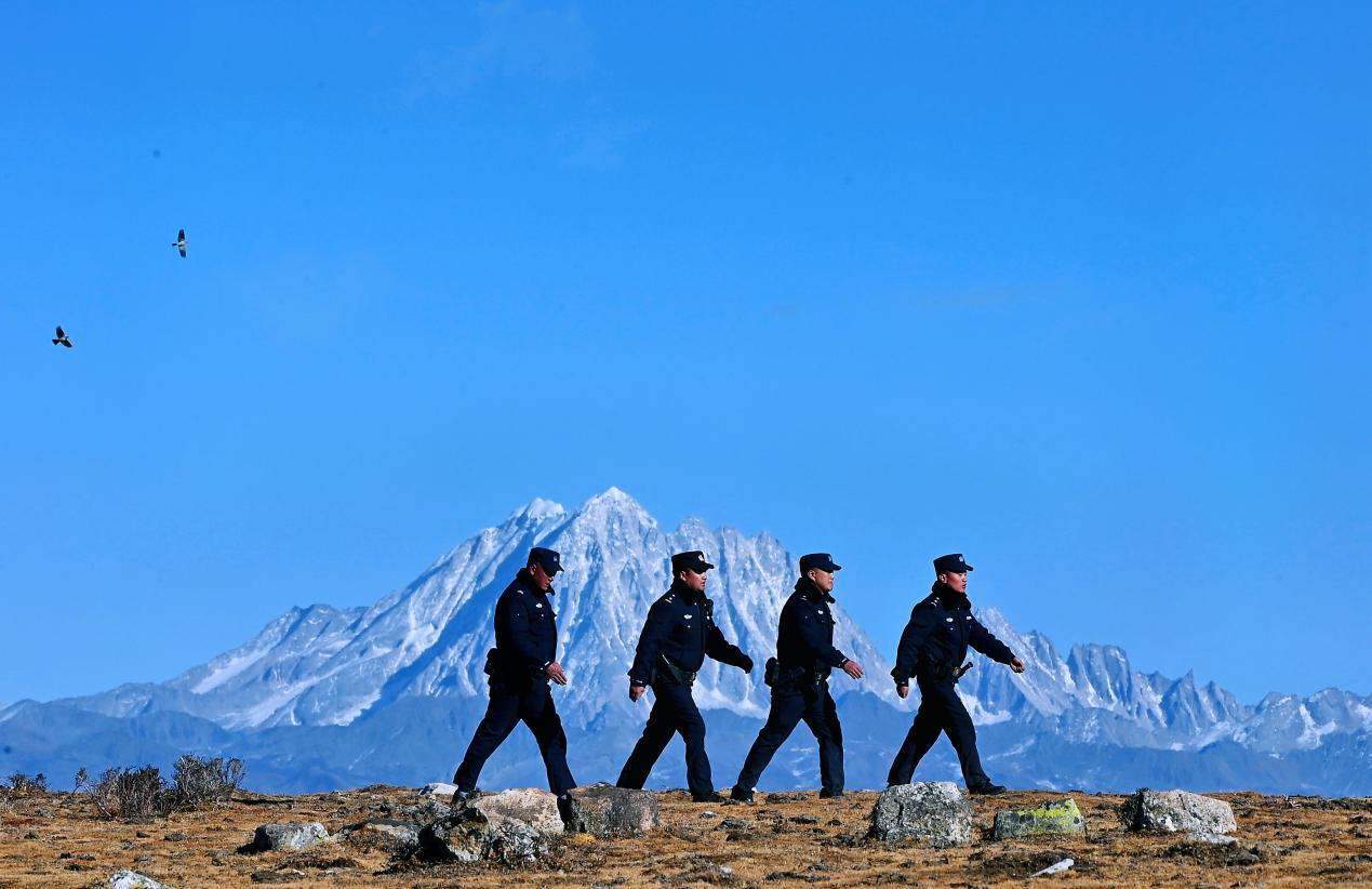 12月18日清晨,氣溫只有零下8攝氏度,警務(wù)站副站長土登郎加帶領(lǐng)著輔警扎西澤仁、仁青、斯郎多吉開始了一天的例行巡邏。湛藍(lán)的天空下,遠(yuǎn)方的雅拉雪山巍峨聳立,雄鷹在空中展翅翱翔,在他們的腳下,是亞洲迄今探明的最大規(guī)模硬巖型單體鋰礦礦區(qū)。