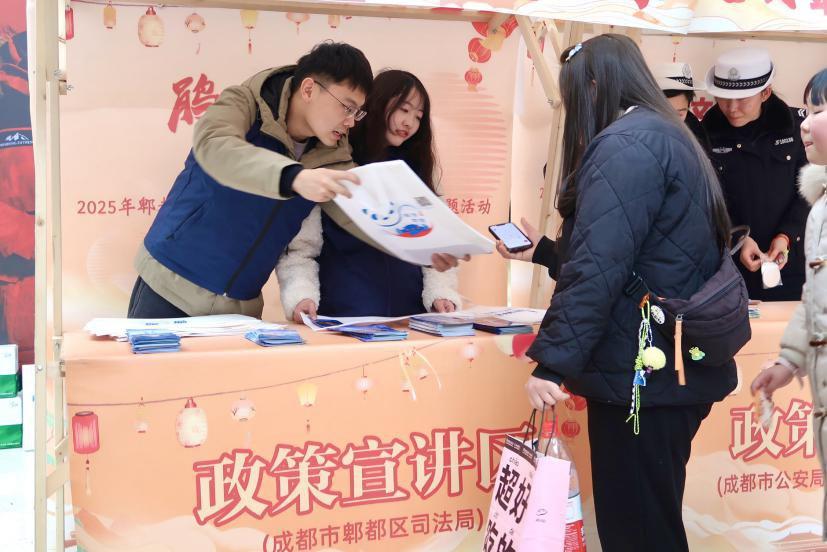 活動現(xiàn)場,非遺川劇變臉、猜燈謎、非遺蜀繡、非遺捏面人、非遺糖畫等節(jié)目吸引眾多居民駐足觀看。普法員為觀看節(jié)目的群眾送上交通安全、防范電信網(wǎng)絡(luò)詐騙、聘請律師指南等普法讀本,結(jié)合典型案例耐心解答群眾的疑問,并介紹12348熱線、“成都司法通”小程序等免費(fèi)法律咨詢方式,引導(dǎo)群眾切實(shí)掌握獲取公共法律服務(wù)的方式,提升法治意識、增強(qiáng)自我保護(hù)能力。