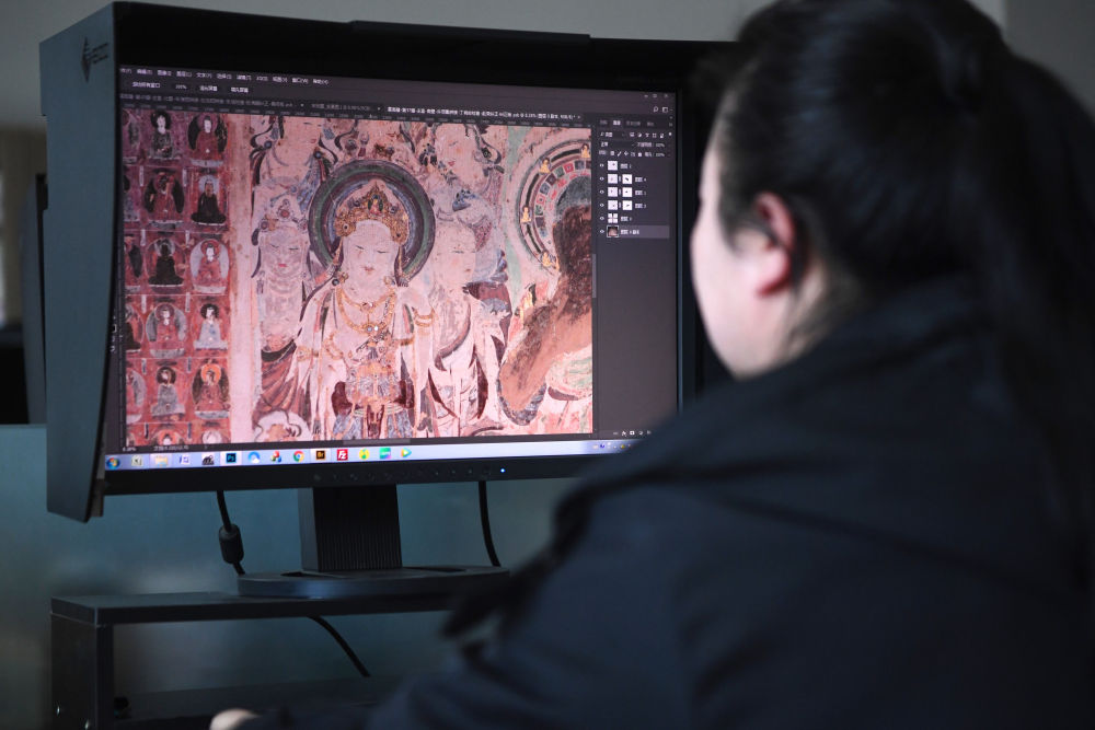 敦煌研究院文物數(shù)字化保護(hù)團(tuán)隊(duì)圖像處理人員年海麗在拼接壁畫圖像(2023年4月25日攝)。數(shù)字化探索為莫高窟的保護(hù)與傳承開辟了全新路徑,數(shù)字技術(shù)讓敦煌文物走出洞窟,跨出國門,走向“永久保存、永續(xù)利用”。新華社記者 陳斌 攝