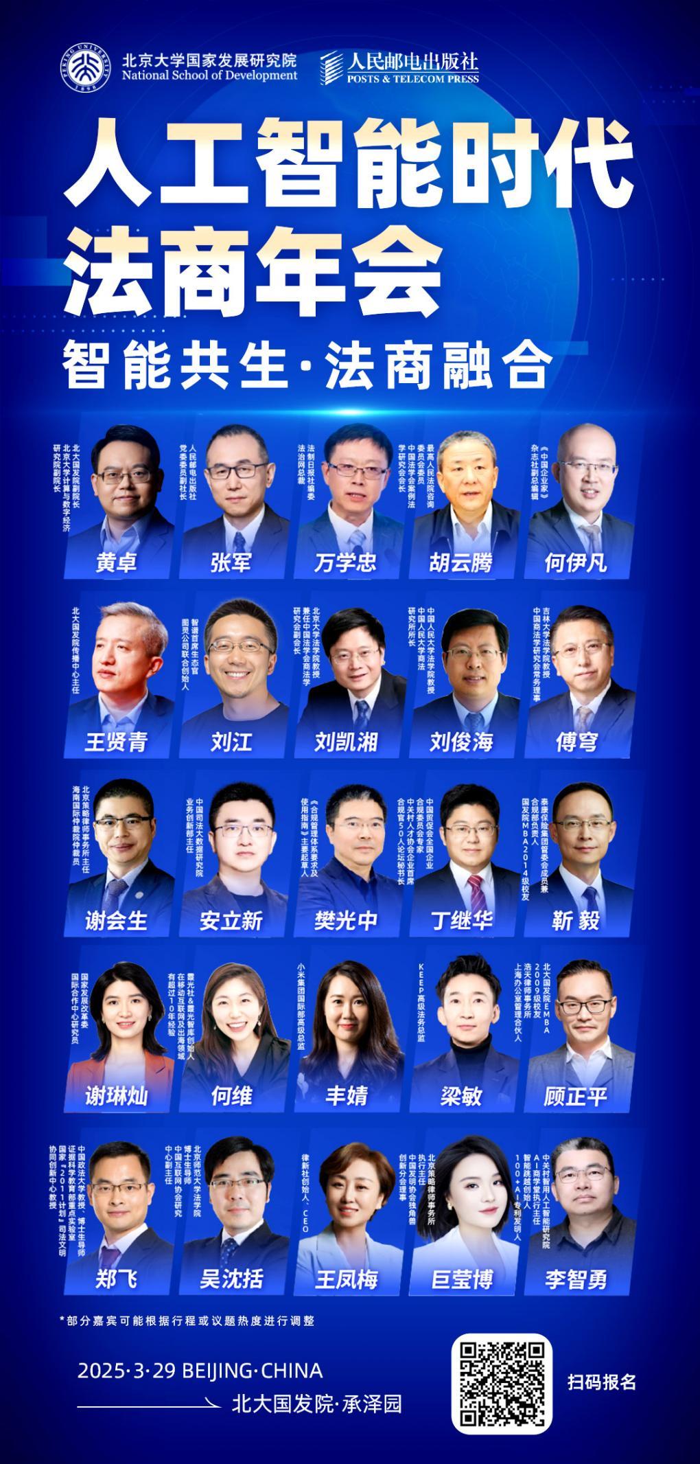 由人民郵電出版社、智元法律課堂聯(lián)合主辦,北京大學(xué)國家發(fā)展研究院、承澤商學(xué)共同協(xié)辦的“2025人工智能法商年會(huì)”將于3月29日在北京大學(xué)國家發(fā)展研究院承澤園校區(qū)盛大舉行。