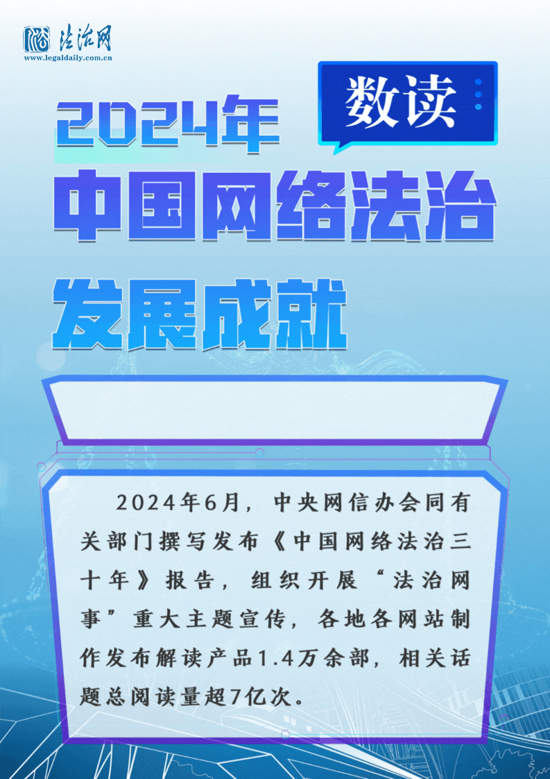 4月27日,國(guó)家互聯(lián)網(wǎng)信息辦公室發(fā)布《中國(guó)網(wǎng)絡(luò)法治發(fā)展報(bào)告(2024年)》。這是首部國(guó)家部門層面發(fā)布的網(wǎng)絡(luò)法治綜合性年度報(bào)告,既是《中國(guó)網(wǎng)絡(luò)法治三十年》報(bào)告的續(xù)篇,也是中國(guó)網(wǎng)絡(luò)法治發(fā)展年度報(bào)告的開(kāi)篇。讓我們用一組數(shù)據(jù)帶你看我國(guó)網(wǎng)絡(luò)法治建設(shè)這一年的成就,感受網(wǎng)絡(luò)法治建設(shè)邁出的堅(jiān)實(shí)步伐。