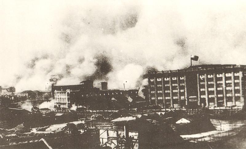 戰(zhàn)火籠罩下的四行倉庫。 (資料圖片)