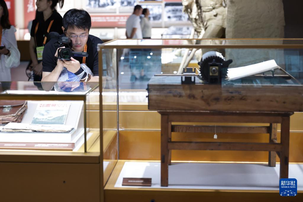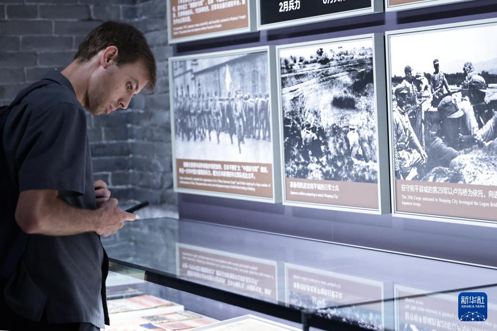 8月27日,一名記者在中國人民抗日戰(zhàn)爭紀念館內(nèi)采訪。新華社記者 張玉薇 攝