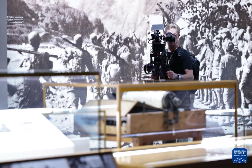 8月27日,中外媒體記者在中國人民抗日戰(zhàn)爭紀念館內(nèi)采訪。新華社記者 張玉薇 攝