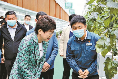 高明芹(左)到山東省壽光市調(diào)研鄉(xiāng)村電氣化建設(shè)工作