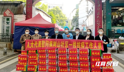 4月6日下午,長(zhǎng)沙市人大代表聶志強(qiáng)(右三)和其他幾位代表在雨花區(qū)東塘街道楓樹山社區(qū)開展慰問。
