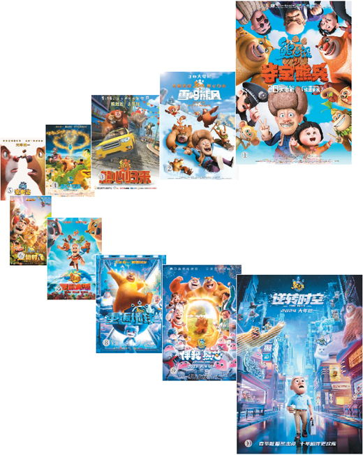 圖①:《熊出沒(méi)之奪寶熊兵》(2014)圖②:《熊出沒(méi)之雪嶺熊風(fēng)》(2015)圖③:《熊出沒(méi)之熊心歸來(lái)》(2016)圖④:《熊出沒(méi)·奇幻空間》(2017)圖⑤:《熊出沒(méi)·變形記》(2018)圖⑥:《熊出沒(méi)·原始時(shí)代》(2019)圖⑦:《熊出沒(méi)·狂野大陸》(2021)圖⑧:《熊出沒(méi)·重返地球》(2022)圖⑨:《熊出沒(méi)·伴我“熊芯”》(2023)圖⑩:《熊出沒(méi)·逆轉(zhuǎn)時(shí)空》(2024)