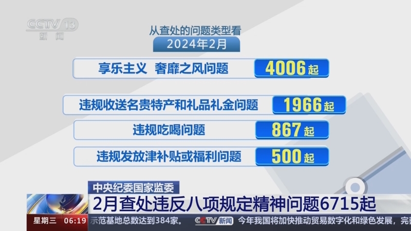 中央紀(jì)委國(guó)家監(jiān)委 2月查處違反八項(xiàng)規(guī)定精神問(wèn)題6715起